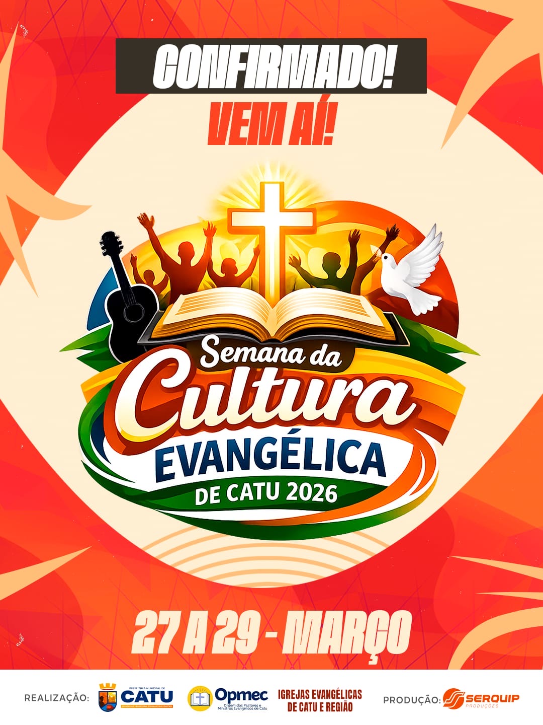 A Prefeitura de Catu confirmou que a Semana da Cultura Evangélica 2026 acontecerá nos dias 27, 28 e 29 de março na Praça da Aruanha.