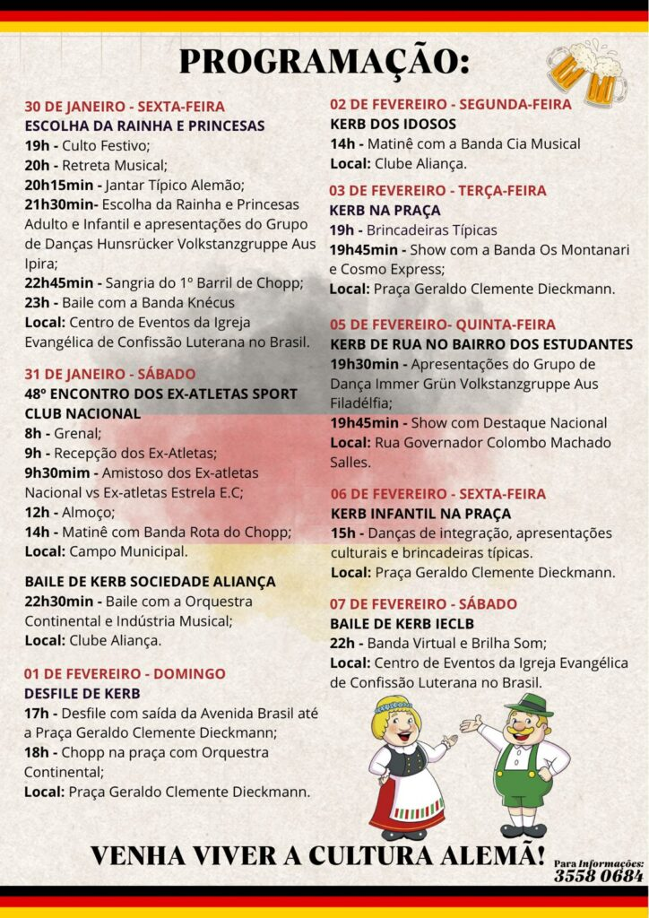 Com uma agenda ampla e plural, o Kerb contará com jantares típicos, bailes, desfiles, manifestações culturais, encontros tradicionais e atrações musicais, além de atividades voltadas ao público infantil. A programação foi pensada para contemplar diferentes faixas etárias, fortalecendo o convívio social e reafirmando o valor da cultura como elemento de união e pertencimento da comunidade ipirense.
